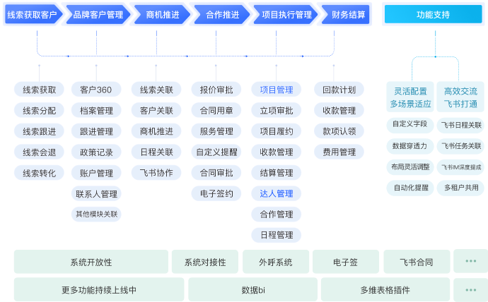不是單一的CRM/項(xiàng)目管理,更多的是基于業(yè)務(wù)現(xiàn)狀搭建適合企業(yè)「業(yè)財(cái)一體」的業(yè)務(wù)流程。